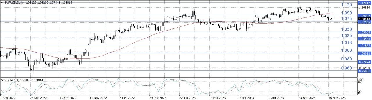 Во вторник, 23 мая, курс EUR/USD снижается на 0,10% и торгуется у отметки в 1,080. Индекс доллара DXY растет на 0,05%, торгуясь у отметки в 103,25. Доллар продолжает укрепление на фоне роста ожиданий того, что ключевая ставка в США будут находится на рекордно высоких уровнях дольше, чем ожидалось. В то же время ситуация с потолком госдолга сохраняла неустойчивые настроения в отношении рисков. Среди множества чиновников Федеральной резервной системы, выступавших в понедельник, некоторые намекнули, что центральному банку, возможно, предстоит ужесточить денежно-кредитную политику. Так глава ФРБ Миннеаполиса Нил Кашкари заявил, что для того, чтобы инфляция вернулась к целевому уровню ФРС в 2%, ставки в США должны быть выше 6%, а глава ФРБ Сент-Луиса Джеймс Буллард сказал, что центральному банку, возможно, придется повысить ставку еще на 50 б.п. в этом году. Валютные рынки оценивают примерно в 20% вероятность того, что ФРС проведет еще одно повышение ставки на 25 б.п. в следующем месяце, и сократили ожидания снижения ставок ФРС в конце этого года, при этом ожидается, что к декабрю ставки будут держаться выше 4,7%. Китай в понедельник оставил свои базовые кредитные ставки на 1 год и 5 лет без изменений, так как ослабление юаня и увеличение разницы в доходности с США ограничило возможности для существенного смягчения денежно-кредитной политики, чтобы поддержать экономическое восстановление страны после пандемии коронавируса. Также инвесторы обеспокоены приближающимся крайним сроком повышения потолка госдолга в США, что сдерживало рисковые настроения и поддерживало американский доллар. Президент Джо Байден и спикер Палаты представителей Кевин Маккарти завершили в понедельник переговоры, не придя к соглашению о том, как повысить потолок госдолга США в размере 31,4 триллиона долларов, и будут продолжать переговоры всего за 10 дней до возможного дефолта. Доходность краткосрочных казначейских обязательств США подскочила, отражая беспокойство рынка. Доходность одномесячных казначейских обязательств в последний раз выросла более чем на 10 базисных пунктов и составила 5,7580%. Доходность растет, когда цены на облигации падают. Доходность двухмесячных казначейских векселей выросла до примерно трехнедельного максимума в 5,4690%. По отношению к японской иене доллар вырос до почти шестимесячного пика 138,88, отражая резкий контраст между все еще «ястребиной» ФРС и «голубиным» Банком Японии. Аналогичным образом, доллар США удерживал юань вблизи недавнего пятимесячного минимума у уровня в 7,05. Китай в понедельник оставил свои базовые кредитные ставки без изменений, так как ослабление юаня и увеличение разницы в доходности с США ограничило возможности для существенного смягчения денежно‑кредитной политики, чтобы поддержать экономическое восстановление страны после кризиса. Касаемо макроэкономической статистики, вчера в еврозоне были опубликованы предварительные данные по индексу потребительской уверенности за май, которые составили -17,4 пункта по сравнению с -17,5 пункта месяцем ранее и прогнозами от аналитиков в -16,8 пункта. Кроме того, стали известны и предварительные данные по индексам деловой активности в производственном секторе и сфере услуг от HCOB в Германии за май, которые показали результат в 42,9 и 57,8 пункта, против 44,5 и 56,0 пункта в апреле и прогнозами от аналити