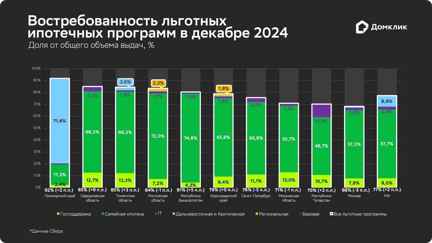 Аналитический центр Домклик Сбербанка рассказал о ключевых событиях на российском рынке ипотеки, которые произошли за последние два месяца – декабрь 2024 и январь 2025 года. В этой части эксперты описали, как меняется востребованность различных льготных ипотечных программ. Приводятся данные в целом по стране и по регионам, лидирующим по спросу.