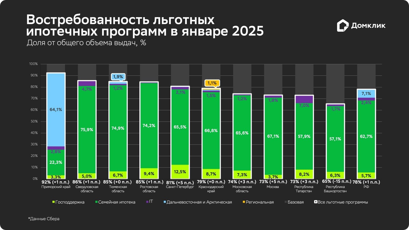 Что касается других льготных ипотечных программ – IT-ипотека, «Региональная ипотека», то их доля скромна: в декабре-январе IT-ипотеку пришлось около 2%, на «Региональную ипотеку» – менее 1%.