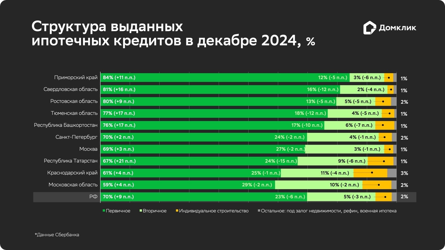 Распределение объема выдач по типам ипотечных кредитов в декабре 2024 года и январе 2025 года: приобретение первичного и вторичного жилья (обозначены как «Первичное» и «Вторичное», соответственно), индивидуальное жилищное строительство (ИЖС). «Остальное» включает в себя нецелевые кредиты под залог недвижимости, рефинансирование, военную ипотеку. Статистика для ТОП-10 регионов РФ по объему выдач. Данные отсортированы по доле первичного рынка в общем объеме ипотечных сделок. В скобках приводится изменение относительно предыдущего месяца (в п. п.). Рынок строящегося жилья Доля первичного жилья в общем объеме ипотечных выдач в декабре выросла сразу на 9 п. п. до рекордного уровня — 70%. В январе 2025 года доля сегмента продолжает оставаться на рекордно высоком уровне (около 71%). В Домклик отметили, что объемы выдач ипотеки на первичном рынке по-прежнему тесно связаны с мерами государственной поддержки. Так, в декабре доля «Семейной ипотеки» в объеме выдач на первичном рынке составила около 74%, в январе — 79%. Отметим, что высокий процент «Семейной ипотеки» (более 70%) сохранялся на протяжении всего второго полугодия 2024 года — период после отмены массовой льготной ипотеки под 8%. Доля «Арктической и Дальневосточной ипотеки» в сегменте первичного жилья также заметна: в декабре на нее пришлось около 11% объема выдач на первичном рынке, в январе — 8%. Статистика за декабрь и январь показала, что по доле первичного рынка лидируют субъекты, на которые распространяется программа «Дальневосточная и Арктическая ипотека». В январе наибольшие значения отмечаются в Архангельской области, Республике Хакасия и в Читинской области: в этих регионах на долю первичного рынка приходится более 85% объема ипотечных сделок. Вторичный рынок На протяжении последних месяцев объемы выдач на рынке вторичного жилья планомерно сокращаются, доля сегмента при этом снизилась до 22-23%. В первый месяц 2025 года лидерами по доле сделок со вторичным жильем стали регионы с относительно низким объемом строительства (статистика Дом.рф): Чеченская Республика, Томская и Амурская области, Карачаево-Черкесская Республика. Как следствие, в этих субъектах доля вторичного рынка в общем объеме выдач не опускается ниже 40%, несмотря на довольно жесткие рыночные условия. Как менялся спрос на рынке ипотеки в целом Согласно данным Сбера, в декабре 2024 года объем выданной ипотеки составил около 150,1 млрд рублей. По отношению к ноябрю объем выдачи кредитов сократился на 12%. Эксперты Домклик пояснили, что отставание прежде всего связано со снижением спроса в сегменте вторичного жилья, что вполне объяснимо: многие, кто планировал купить готовое жилье, поспешили оформить сделки до повышения процентных ставок. Объем выдач на первичном рынке при этом остался практически без изменений. В Домклик добавили, что в декабре также сократился объем выдач на кредитование ИЖС, которое является гораздо менее массовым по сравнению с первичным и вторичным рынками: в декабре–январе доля ИЖС составила около 5% от всего объема выдач. Источник - Сбербанк Авторизуйтесь, чтобы оставить комментарий. |
