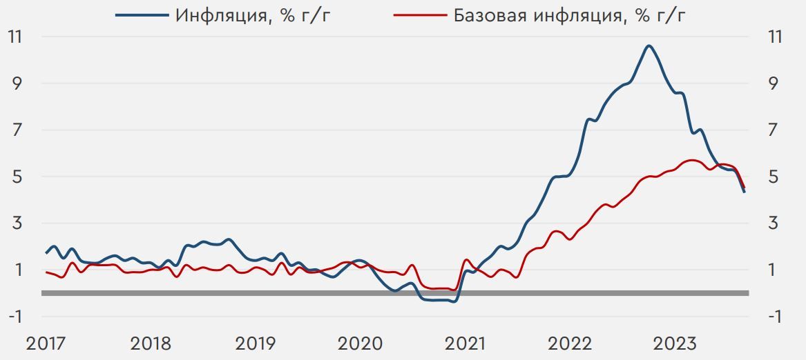 В центре внимания. На прошлой неделе на глобальном рынке спрос на рисковые активы заметно ослабился. Инвесторы продолжили отыгрывать жесткую риторику ФРС, в результате чего доходности на рынке заметно росли, а доллар укреплялся. Отдельное давление на евро оказывали ожидания завершения цикла ужесточения ДКП ЕЦБ, на что указывала и сентябрьская ценовая статистика (см. развернутый комментарий). На российском рынке инвесторы на прошедшей неделе отыгрывали параметры проекта бюджета на 2024-2026 года. В предстоящем году Минфин планирует нарастить расходы на 21% до 36,6 трлн руб., что при прочих равных усиливает проинфляционные риски и может потребовать дальнейшее повышение ключевой ставки. О рисках ужесточения ДКП напомнило также резкое ускорение недельной инфляции, хоть и инфляционные ожидания населения в сентябре выросли лишь умеренно. Главным событием этой недели для мирового рынка будет публикация сентябрьской трудовой статистики в США. Сильное состояние американского рынка труда увеличит вероятность роста ставки ФРС на ноябрьском заседании и окажет дополнительное давление на рисковые активы. В России сейчас инвесторы продолжат следить за ситуацией на валютном рынке, а также обратят внимание на сентябрьские индексы деловой активности и оценку нефтегазовых доходов бюджета. Нефть и рубль. По итогам прошлой недели цены на нефть снизились. Давление на котировки оказывает глобальное укрепление доллара, хоть и позитивные данные из Китая напоминали об ожидаемом усилении дефицита нефти. Сегодня фьючерсы Brent торгуются у $92,5/барр. В целом у котировок остается потенциал к возврату к $95/барр. в отсутствии рекомендаций по наращиванию добычи со стороны ОПЕК+ в среду. Большую часть прошедшей недели рубль не показывал ярко выраженную динамику, но после завершения налогового периода он перешел к заметному ослаблению. Сегодня курс USDRUB находится у 98,2 руб./$. Другие курсы валют EM с утра двигаются разнонаправленно. В последнее время рубль показывает негативную динамику в первой половине каждого месяца, и сейчас есть риски временного роста курса USDRUB выше 99 руб./$. При этом стоит подчеркнуть, что на этой неделе дополнительным фактором волатильности на валютном рынке будут выходные дни в Китае, в результате которых ряд расчетов по операциям с юанем проводиться не будет. Инфляция в еврозоне. Пятничная статистика указала на замедление инфляции в еврозоне с 5,2% г/г до 4,3% г/г в сентябре (прогноз 4,5% г/г), минимума за почти два года. Такой динамике способствовало замедление роста цен на услуги и продовольствие, а также усилившееся снижение цен на энергию, что, впрочем, не будет продолжительным. Более важно, что темпы роста базового показателя (за исключением цен на энергию и продовольствие) снизились сразу на 0,8 п.п. до 4,5% г/г (прогноз 4,8% г/г). Ослабление ценового давления на фоне мягких сигналов со стороны ЕЦБ указывает на низкую вероятность еще одного повышения ставки в еврозоне, что затруднит существенный рост курса EURUSD с текущих минимумов. Инфляция и базовая инфляция в еврозоне
