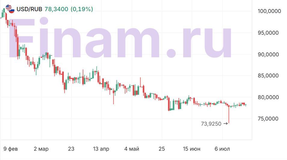 22 июля валютная пара USD/RUB торгуется на межбанковском рынке в районе 78,2 руб. Как видим, почти весь июль торги проходят в очень узком торговом диапазоне 77-79 руб. Как минимум до очередного заседания ЦБ РФ (25 июля) спокойная динамика курса рубля сохранится.