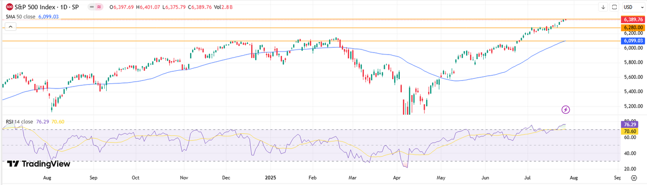 Индекс S&P 500 продолжает демонстрировать устойчивый восходящий тренд, торгуясь на уровне 6 389,7. Индекс движется к формированию нового сильного сопротивления в районе 6 400. При этом RSI превышает 70, что сигнализирует о зоне перекупленности и повышает вероятность краткосрочной коррекции или консолидации после такого активного роста. Тем не менее пока индекс стабильно выше SMA 50 и не формирует серии локальных минимумов, техническая картина остаётся в пользу быков.