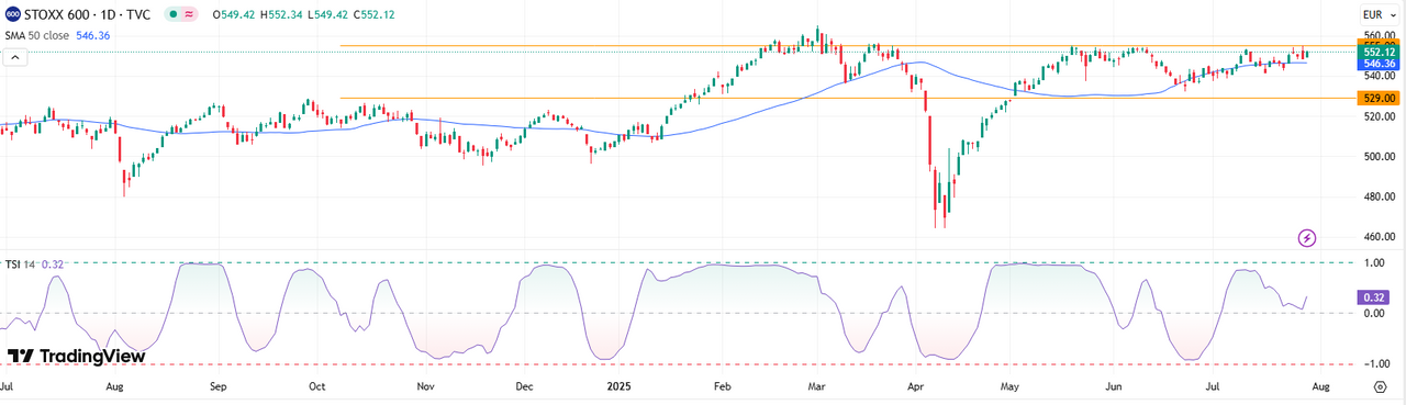 На дневном графике индекс Stoxx 600 торгуется на уровне 552,26 и продолжает движение в восходящем тренде. Индикатор TSI (Trend Strength Indicator) находится на отметке 0,32, что сигнализирует о нейтральной или слабой направленности тренда и возможной консолидации вблизи текущих уровней. Ближайшее сопротивление по-прежнему располагается на 555 пунктах, поддержка — на 529.