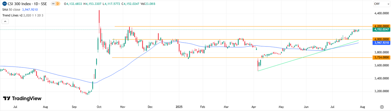 Индекс CSI 300 продолжает движение в рамках восходящего тренда и закрепился на отметке 4152, заметно выше 50-дневной скользящей средней которая находится в районе 3947 пунктов, что подтверждает преобладание спроса на рынке. Ближайшее сопротивление сохраняется на уровне 4200 пунктов.
