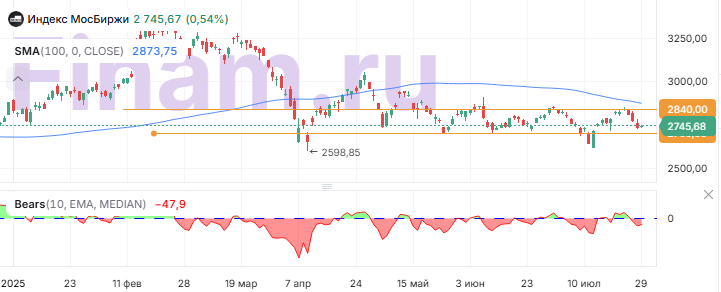 Индекс МосБиржи торгуется на уровне 2746, оставаясь ниже 100-дневной скользящей средней, что сигнализирует о сохраняющемся давлении продавцов. Индекс силы медведей (Bear Power (EMA 10)) в отрицательной зоне, что подтверждает слабость рынка. Ближайшая поддержка — 2700, сопротивление — 2840; для выхода из боковика индексу необходимо закрепиться выше этого уровня.