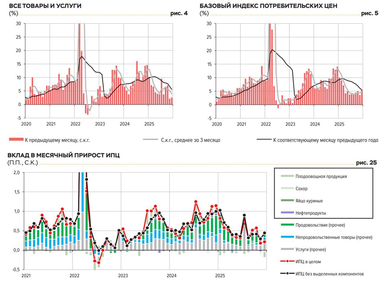В основном это эффект разовый, связанный с НДС и налогами, а также переносом роста цен с конца 2025 года на начало 2026 года - все приурочили к НДС. Если учесть, что 0,6-0,7 п.п. - это оценка январской инфляции ближе к 4% (SAAR) и пока игнорировать "огуречное ралли" - то лично я пока не вижу ничего ужасного, хотя внешне цифры и выглядят высокими (~20% SAAR) в январе. Но они будут смещать годовую инфляцию вверх за счет переноса части роста цен с конца 2025 года на 2026 год. Банк России дал свою оценку сезонно-сглаженной инфляции за декабрь 0,21%, или 2,6% (SAAR). Это означает, что инфляция в 4 квартале опустилась до 3,9% (SAAR) - впервые с 2023 года упав ниже 4% (SAAR). Показатели устойчивой инфляции (с.к.г.) в декабре преимущественно возросли. В среднем за 4к25 их приросты сложились в диапазоне 4–6% (с.к.г.) и находились вблизи значений 2–3к25 или немного выше. Средняя за три месяца инфляция временно подрастет до 8-9% (SAAR), средняя за полгода до 6,5-7% (SAAR). Крайне низкая инфляция ноября-декабря компенсируется всплеском в январе, но в общем-то именно исходя из этих соображений и шла речь в декабре, что действовать по ДКП надо осторожно и не торопиться с реакцией на резкое снижение инфляции в конце года. P.S.: Месячная динамика в январе в пределах 2% в принципе в рамках разумного, если делать скидку на овощи и эффекты конца года.