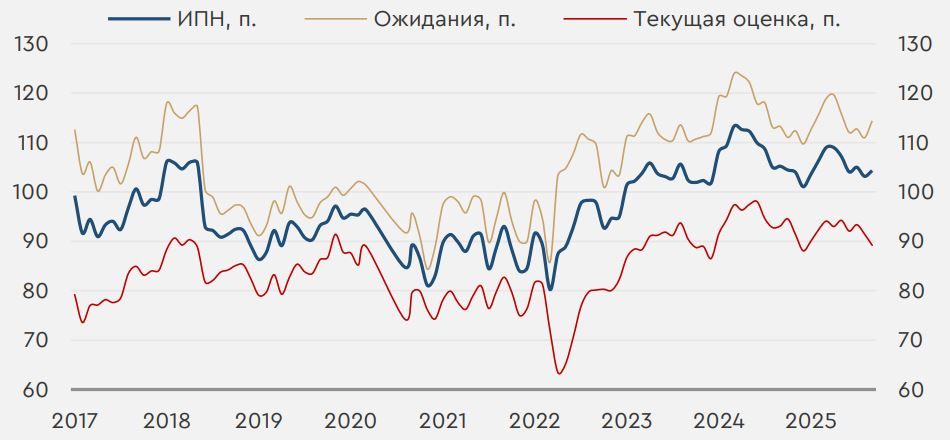 В четверг на мировом рынке сохранились умеренно негативные настроения. По вышедшим итоговым оценкам, рост ВВП США за второй квартал был пересмотрен с 3,3% до 3,8% SAAR, максимума с третьего квартала 2023 года. Столь сильный рост американской экономики уменьшает вероятность форсированного снижения ставки ФРС, что позволило доллару укрепиться. Российский рынок вчера продолжил снижаться. Инвесторы отыгрывали статистику среды, в том числе полные данные сентябрьского опроса инФОМ (см. развернутый комментарий), и возможные последствия изменений в бюджете. При этом глава Банка России вчера заявила, что ЦБ видит проектировки бюджета дезинфляционными даже с учетом повышения НДС. В центре внимания инвесторов сегодня будет публикация августовского ценового индекса PCE, который таргетирует ФРС. Мировой рынок будет также отыгрывать новости о планируемом введении новых пошлин США, в частности, на грузовики и лекарства. В России инвесторы в пятницу будут следить за геополитическими новостями, особенно в контексте санкций ЕС. На динамику долгового рынка повлиять может публикация второго проекта Основных направлений единой государственной ДКП Банка России, если регулятор приведет в ней новые значимые вводные. Нефть и рубль Нефтяные цены вчера незначительно подросли несмотря на умеренное укрепление доллара в мире. Поддержку котировкам мог оказать официальный анонс продления до конца года запрета на экспорт бензина из РФ с расширением ограничений и на поставки дизеля для непроизводителей. Сегодня фьючерсы Brent торгуются у $69,4/барр. Неделю цены способны закончить выше $69/барр., если сегодняшние данные по PCE не вызовут дальнейшее укрепление доллара США. В четверг рубль не показывал ярко выраженную динамику. Впрочем, сегодня курс CNYRUB опустился к 11,67 руб./юань. Такую динамику рубль может показывать из-за продаж валюты в рамках налогового периода – он завершается в понедельник. Другие валюты EM с утра двигаются разнонаправленно. В моменте рубль способен укрепляться, но далее, вероятно, курс вновь будет двигаться вокруг 11,70 руб./юань. Потребительские настроения в России Полные данные сентябрьского опроса инФОМ, выпущенные в среду, показали рост индекса потребительских настроений россиян с 103,16 лишь до 104,30 п. Дальнейшее ухудшение оценок текущей ситуации компенсировалось улучшением ожиданий населения до рекордных с мая уровней. За месяц доля респондентов, считающих, что свободные деньги сейчас лучше откладывать, выросла с 52% до 56%, максимальных с марта 2023 года уровней. С другой стороны, доля опрошенных, ожидающих через год более высокий курс USDRUB, увеличилась на 2 п.п. до 32%, максимума с февраля. В целом сентябрьские данные от инФОМ позитивны для ЦБ, но на фоне бюджетных изменений (особенно повышения НДС) инфляционные ожидания населения в октябре рискуют вернуться к росту. Градус их увеличения во многом будет определяющим для исходов октябрьского заседания ЦБ РФ. Риски «паузы» в процессе смягчения ДКП пока видятся значимыми. Индекс потребительских настроений в РФ и его субагрегаты