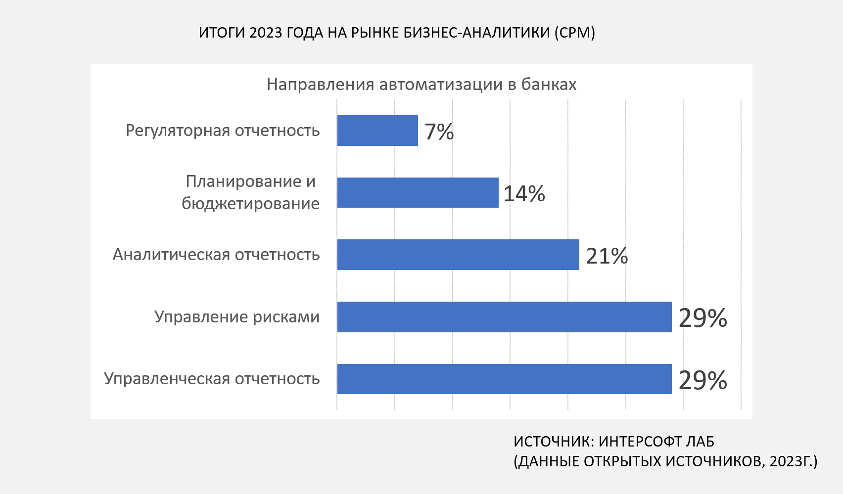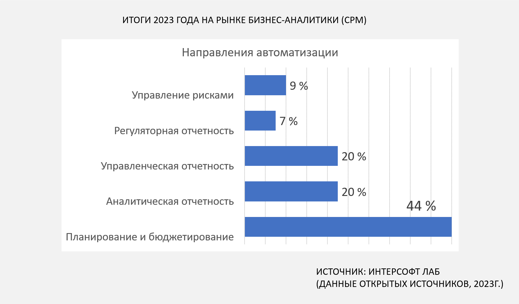 Рис.3. Доля банков, как потребителей бизнес-аналитики. В 2023 году на рынке по всем отраслевым направлениям наблюдался бум проектов автоматизации планирования и бюджетирования. С этой целью организации выполнили 44% проектов.