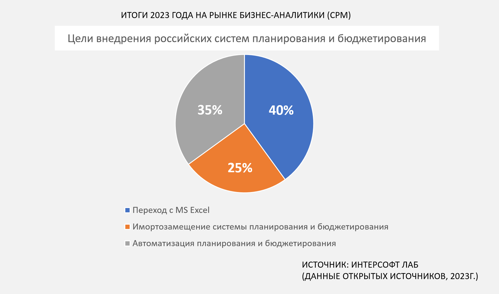 Рис. 4 Направления использования систем бизнес-аналитики. Такое активное импортозамещение систем бюджетирования было обусловлено уходом западных вендоров и прекращением работы с корпоративными клиентами Microsoft, электронные таблицы которой были в фаворитах у финансовых департаментов. 40 % проектов было выполнено с целью замены excel-технологии бюджетирования на специализированные российские решения (см. Рис.5).