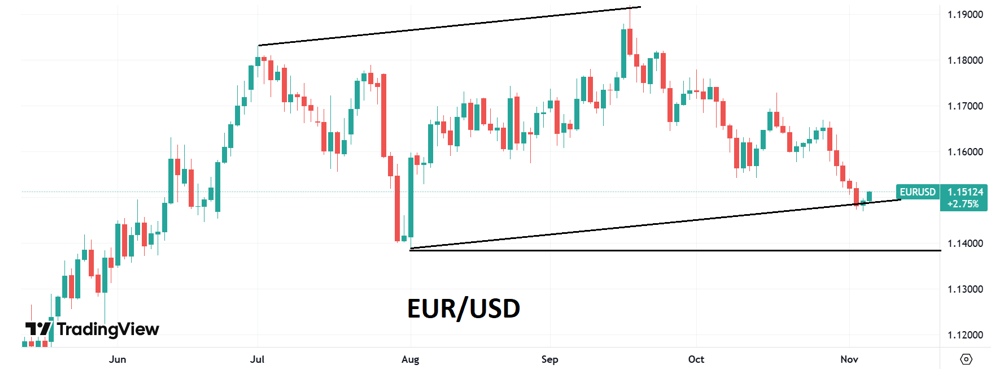 В среду индекс доллара подрос до отметки 100,36, но из-за накопившейся перекупленности после нескольких дней роста, сейчас он ушел в неглубокую коррекцию, снизившись до 100,0. Соответственно курс евро стал восстанавливать свои позиции после 5 сессий непрерывного снижения. Этим утром пара EUR/USD торгуется возле 1,151. Схожая динамика сейчас у британского фунта стерлингов, курс которого вчера остановил падение к доллару на отметке 1,301 и сейчас GBP/USD восстановился до 1,306. Курс японской иены в последние дни консолидируется немного ниже отметки 154,0 к доллару. На фоне передышки в укреплении доллара мы видим, что пара USD/CNY этим утром снизилась до 7,123. Биржевые СМИ пишут, что индекс доллара стал корректироваться на фоне улучшения настроений на фондовых биржах и снижении спроса на защитные валюты. На наш взгляд локальная коррекция пока мало что изменила. Просто к ноябрю доллар уже отыграл все значимые факторы ослабления и сейчас пришло время для его коррекции. Поэтому после текущего локального снижения подъем индекса доллара может быть продолжен. Напомним, что в начале этой недели доллар США получил поддержку благодаря росту ожиданий того, что ФРС сохранит уровень ставок неизменным в декабре, поскольку голосующие члены FOMC сигнализируют об осторожной позиции в отношении дальнейшего смягчения ДКП. Неплохие данные по рынку труда США и деловой активности за октябрь поддержали спрос на доллар. Свежий отчёт ADP сигнализировал о стабилизации рынка труда после двух месяцев сокращения рабочих мест, а индекс деловой активности в сфере услуг ISM вырос до восьмимесячного максимума. Согласно данным ADP в октябре частный бизнес в США добавил 42 тыс. рабочих мест, восстановившись после сокращения на 29 тыс. рабочих мест в сентябре и превысив прогнозы роста на 25 тыс. Частные работодатели добавили рабочие места в октябре впервые с июля, но это восстановление не было широкомасштабным. Годовые темпы роста заработной платы в октябре остались на уровне предыдущего месяца, составив 4,5% для тех, кто остался на прежней работе, и 6,7% для тех, кто сменил работу. В последние дни рост доходности государственных облигаций США помогал восстановлению спроса на доллары. 10-летние USTres сейчас дают 4,16% - это самый высокий уровень за месяц. Чем лучше выходят данные по экономике США, тем меньше поводов ждать роста цен на USTres. В этой связи вчерашний отчет ADP был под более пристальным вниманием инвесторов, поскольку отчетов BLS о рабочих местах не выходит из-за остановки работы правительства. Идут уже 37 сутки того, как американское правительство приостановило свою работу – это новый рекорд shutdown по продолжительности. Причина этого в том, что к началу текущего финансового года (1 октября) Конгресс не утвердил новый годовой бюджет и даже схему временного финансирования госрасходов, поскольку демократы и республиканцы имеют серьезные расхождения мнений на счет расходов в сфере здравоохранения. Чем дольше длится этот политический кризис, тем больнее приходится экономике США, поскольку без оплаты находятся около 1,350 млн. федеральных служащих. Согласно опроса ABC/Ipsos: 45% респондентов винят в кризисе республиканцев, 33% — демократов. Федеральное управление гражданской авиации США (FAA) с 7 ноября сократит объем авиаперевозок на 10% в 40 крупнейших аэропортах страны из-за дефицита диспетчеров по причин