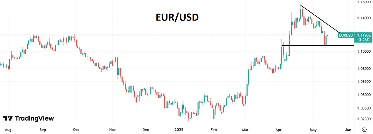 Курс евро в начале этой недели побывал возле поддержки на 1,107 и к среде он восстановился почти до 1,12, поскольку инвесторы переварили более сильные, чем ожидалось, экономические настроения Германии и неожиданное снижение инфляции в США. Индикатор экономических настроений ZEW для Германии в мае вырос на 39,2 п. до 25,2 п., резко восстановившись с почти двухлетнего минимума -14,0 в апреле и значительно превзойдя рыночные ожидания в 11,9. Это стало возможно из-за растущего оптимизма в отношении следующих 6 месяцев, обусловленного формированием нового федерального правительства, прогрессом в разрешении тарифных споров с США и признаками стабилизации инфляции. Почти все секторы экономики сообщили об улучшении настроений в мае. Между тем текущая экономическая оценка Германии остается низкой, опустившись на 0,8 п. до -82,0 п.