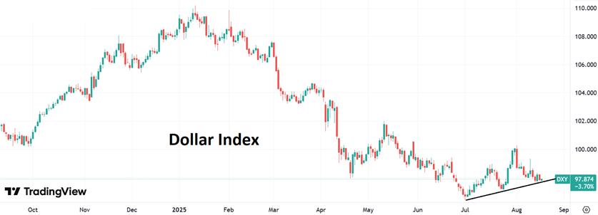 В понедельник утром индекс доллара торгуется с нейтральной динамикой у отметки 97,9. По итогам прошлой недели DXY зафиксировал снижение на 0,4%, после схожей просадки неделей ранее. Курс евро на этом фоне консолидируется в районе 1,172, то есть вблизи 3-недельных максимумов. Пара GBP/USD закрыла прошлую неделю ростом на 0,87% и в начале этой недели торги идут возле 1,355. Курс японской иены за последние две недели почти никуда на ушел из зоны консолидации 146,8-148,0. Китайский юань также продолжает торговаться в районе 7,18 к доллару США. Котировки биткоина на прошлой неделе обновили исторические максимумы ($124517), но закрытие недели было в красной зоне, поэтому в начале этой недели курс продолжает слабеть ($115000). В начале этой недели мировой валютный рынок демонстрирует относительную стабильность поскольку есть неопределенность по двум ключевым событиям. 1. Встреча президентов США и Украины с участием ряда европейских лидеров в Вашингтоне в понедельник по вопросу завершения российско-украинского конфликта и мирного урегулирования. Если Украина согласится на быстрое мирное соглашение, это положит конец кровопролитию на Востоке Европы, что может усилить позиции евро. 2. Симпозиум с участием глав ведущих Центробанков мира, который организует ФРБ Канзаса в Джексон-Хоул 21-23 августа. Инвесторы традиционно будут ждать сигналов относительно дальнейших перспектив денежно-кредитной политики. Рынки сейчас оценивают вероятность снижения процентных ставок ФРС в сентябре на 0,25% в 84%, по сравнению с 98% на прошлой неделе, поскольку ряд смешанных данных, вернувших опасения относительно инфляции, снизили вероятность значительного снижения ставки на 50 б.п. Опубликованные в пятницу данные показали, что в июле розничные продажи в США выросли на 0,5% м/м, что соответствовало ожиданиям рынка и после пересмотренного в сторону повышения роста на 0,9% в июне. При этом, продажи без учета общепита, автодилеров, магазинов стройматериалов и автозаправочных станций, которые используются для расчета ВВП, выросли на 0,5% после пересмотренного в сторону повышения роста на 0,8% и также превысили ожидания в 0,4%. Это дает основания считать, что американский потребитель стабильно наращивает потребление товаров, то есть несмотря на некоторое ухудшение ситуации на местном рынке труда, сокращения потребительской активности пока не замечено. Цены на товары, импортируемые Соединенными Штатами, в июле подскочили на 0,4% по сравнению с предыдущим месяцем, что контрастировало с рыночными ожиданиями неизменных цен. Это был самый резкий рост с апреля прошлого года, что свидетельствует о том, что иностранные компании пока не снизили свои отпускные цены для сохранения конкурентоспособности своих товаров на американском рынке. Потребительские настроения Мичиганского университета в августе упали до 58,6 против 61,7 в июле и оказались значительно ниже рыночных ожиданий (62,0). Это ухудшение настроений в основном было вызвано растущими опасениями по поводу инфляции и ухудшения условий покупки товаров длительного пользования. При этом годовые инфляционные ожидания потребителей подскочили до 4,9% с 4,5%, а пятилетний индикатор ожиданий вырос до 3,9% с 3,4%. Объем промышленного производства в США в июле уменьшился на 0,1% м/м, хотя изменений не ожидалось. Согласно пересмотренным данным, в июне показатель увелич