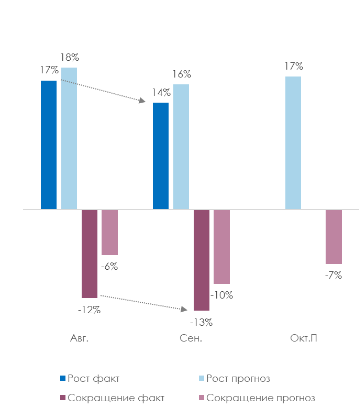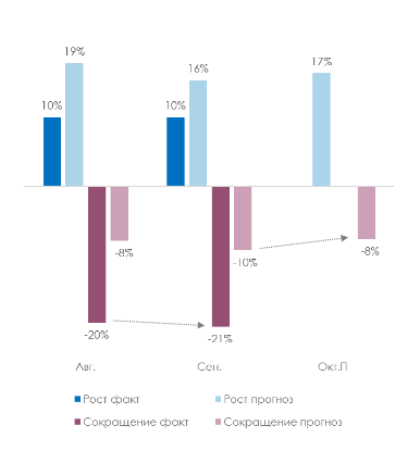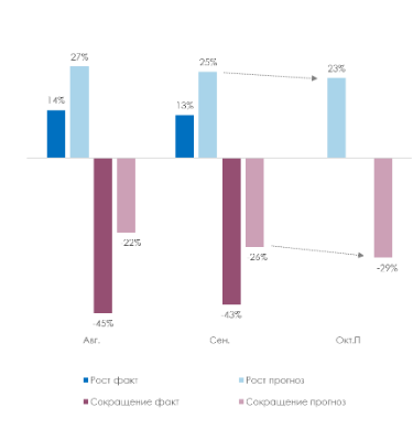 Источник: ПСБ Аналитика, НАФИ Компонента Кадры незначительно выросла (+0,5 п.п.), оставаясь в области спада. У бизнеса продолжает снижаться стремление к набору персонала: сокращали штат 21% МСП (-1 п.п.), в то время как нанимали — вдвое меньше (10%). Чаще персонал сокращал средний бизнес (28% МСП). Некоторое улучшение в компоненте было обеспечено небольшим ростом позитивных ожиданий компаний в части кадров: доля тех, кто планирует сокращение штата, вернулась к июльскому уровню (8%, — 2 п.п.). Фактические и ожидаемые изменения штата сотрудников в компаниях МСП