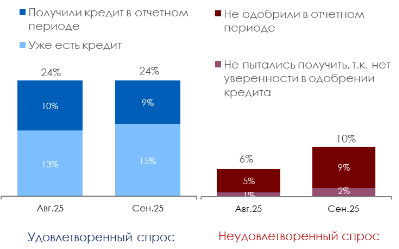 Источник: ПСБ Аналитика, НАФИ Компонента Кредиты откатилась к уровню апреля-июля текущего года. Снижение компоненты произошло на фоне роста неудовлетворенного спроса из-за увеличения отказов по кредитам: 9% респондентов (+4 п.п.) не смогли получить заемное финансирование. Вместе с тем одобрение по кредиту получили также 9% МСП (-1 п.п.). В целом спрос на кредиты со стороны компаний вырос на фоне смягчения денежно-кредитной политики: доля МСП, уже имеющих кредит, достигла максимума за последние восемь месяцев, составив 15% (+2 п.п.). Изменение доступности банковского кредита в компаниях МСП (Числа в графиках округлены)