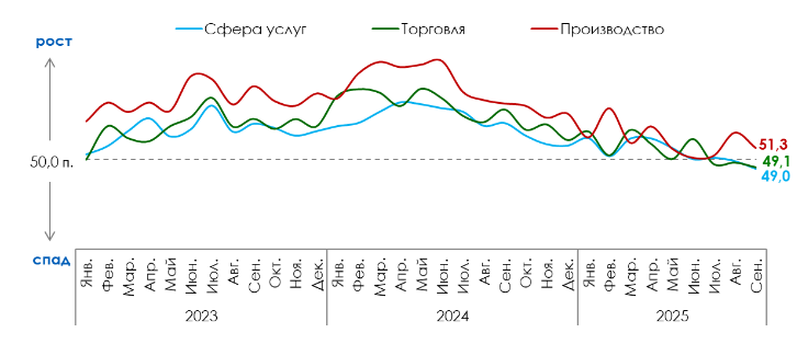 Источник: ПСБ Аналитика, Magram Market Research, НАФИ Индекс RSBI по видам деятельности В сентябре индексы по всем видам деятельности снизились, при этом индексу производства удалось удержаться в зоне умеренного роста — 51,3 пункта. Основным фактором ослабления производственного сегмента (-1,7 п.п.) стало ухудшение доступности финансирования. В сегменте сферы услуг индекс снизился до 49 пунктов (-0,8 п.п.). Драйвером снижения стало падение фактических показателей продаж и более сдержанные планы по выручке. Ситуация с кадрами также остается непростой: позитивные ожидания бизнеса были нивелированы снижением в фактическом найме. Индекс торговли составил 49,1 пункта (-0,6 п.п.), показав отрицательную динамику из-за снижения доступности кредитов и ухудшения ожиданий по выручке. Индекс RSBI по видам деятельности