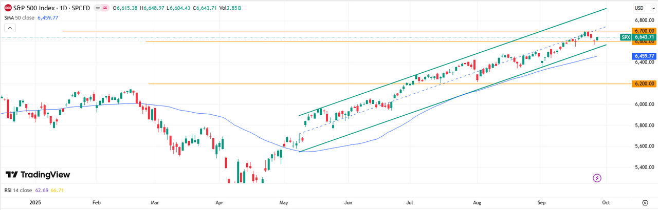 S&P 500 В последней торговой сессии S&P 500 возобновил рост, завершив день на отметке 6 644. Индикатор RSI составляет 66,7, что свидетельствует о приближении к зоне перекупленности. Ближайшей целью для быков остаётся тест уровня 6700: пробой этого сопротивления станет сигналом для дальнейшего продолжения ралли. В случае фиксации прибыли со стороны инвесторов вероятна консолидация индекса в диапазоне 6600–6700.