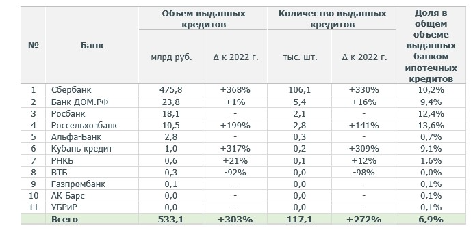 Приросты к соответствующему периоду прошлого года рассчитаны по данным предыдущих отчетов «Итоги работы крупнейших ипотечных банков» Источники: ДОМ.РФ, данные банков. «Рейтинг представляет собой наиболее развернутый набор таблиц, которые ранжируют крупнейшие банки как по общему объему выдачи ипотеки, так и в продуктовом разрезе: с разбивкой по рыночным ипотечным программам и по программам с господдержкой. В результате мы фактически в режиме реального времени видим, как меняются те или иные позиции банков в зависимости от колебаний рыночной конъюнктуры. Так, в январе 2024 года ряд крупных банков ввели комиссии для застройщиковпо льготным кредитам или ограничили их выдачу. Это найдет отражение в нашем рейтинге», — отметил руководитель Аналитического центра ДОМ.РФ Михаил Гольдберг. Крупнейшие банки по выдаче ипотеки на ИЖС за 2023 г.