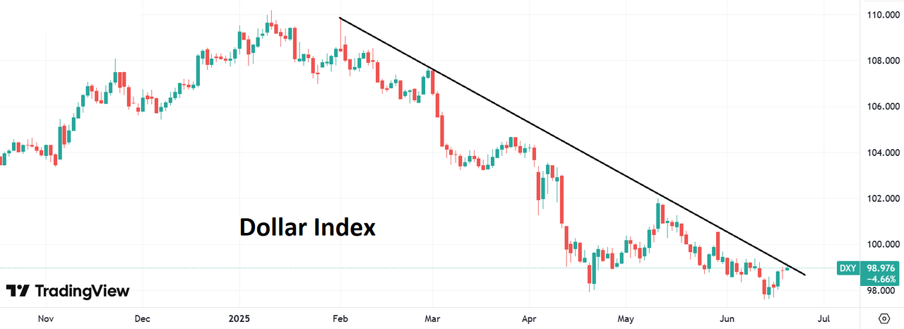 В четверг утром индекс доллара США прибавляет 0,26% (99,10). Всего за последние 5 сессий DXY смог восстановиться на 1,4%. На этом фоне курс евро (1,1456), британского фунта (1,3394), японской иены (145,26) и китайского юаня (7,191) немного сдают свои позиции против американской валюты. Усиление доллара произошло после подведения итогов заседания ФРС, хотя биржевые СМИ пишут, что причиной усиления доллара стало повышение спроса на безопасные активы из-за угрозы более масштабного конфликта на Ближнем Востоке и возможного участия в нем США. Странно, что при этом цена на золото активно снижается ($3349/унц, -0,6%).