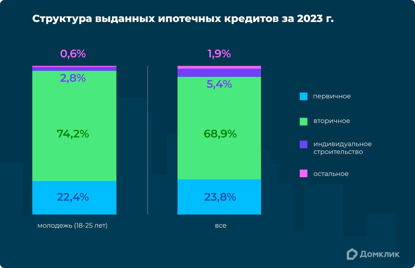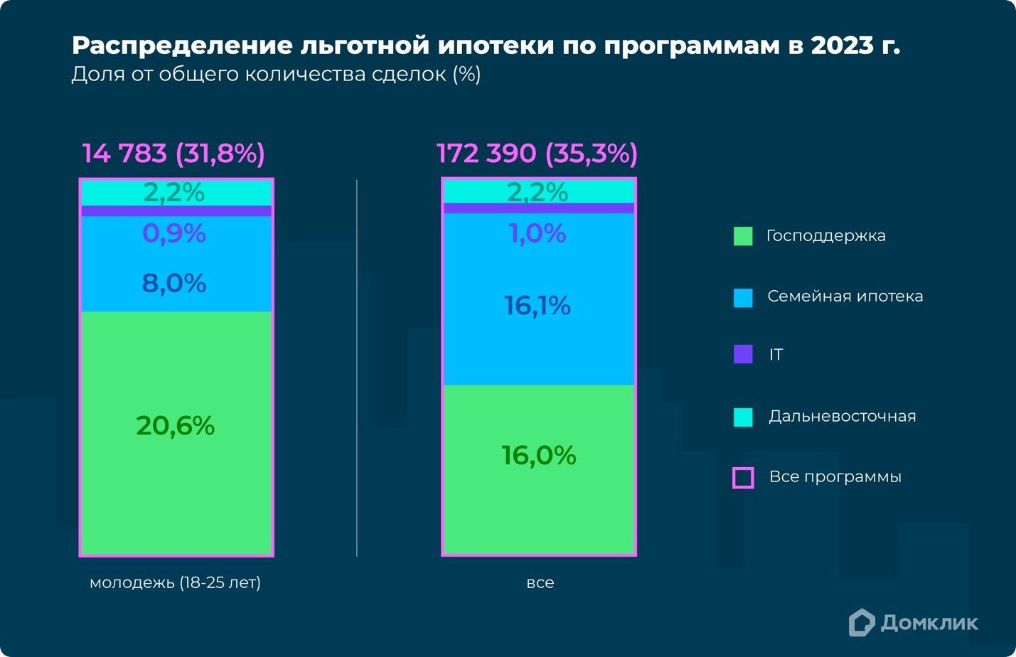 Рис. 2. Распределение ипотеки по типам кредитов среди молодёжи (18−25 лет) и всего российского населения в 2023 году. Приобретение первичного и вторичного жилья обозначены как «Первичное» и «Вторичное» соответственно. Приведены данные по индивидуальному строительству. По данным за 2023 год, молодые люди предпочитают готовое жильё новостройкам и загородной недвижимости. Его доля в структуре сделок, заключённых молодёжью (74,2%), превышает показатель на всём рынке ипотечного кредитования (68,9%). По мнению аналитиков Домклик, молодёжь предпочитает вторичную недвижимость, поскольку не нужно ждать ввода жилья в эксплуатацию и тратить время на ремонт. Сравнение первого полугодия 2023 года с аналогичным периодом 2021 года показало следующие особенности спроса: несмотря на явное преобладание вторичного жилья в общей структуре выдач, интерес к строящемуся жилью растёт: за два года прирост по количеству сделок составил 20,3%; более существенный рост спроса на ИЖС по сравнению с данными по всем заёмщикам. За два года количество сделок на рынке индивидуального строительства, заключённых молодёжью, выросло в 11,4 раза, а по РФ — в 8,4 раза. Какие льготные программы предпочитает молодёжь