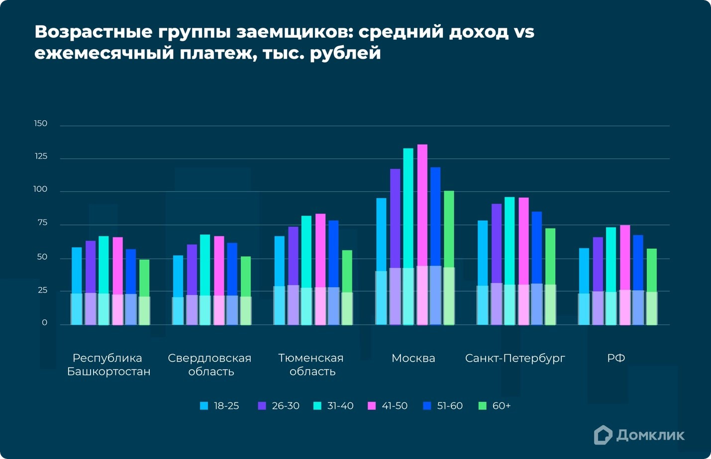 Рис. 4. Соотношение медианного ежемесячного дохода молодёжи (18−25 лет) и медианного ежемесячного платежа по ипотеке в 2023 году. Представлены данные для топ-3 регионов по количеству выдач молодым людям, а также для Москвы, Санкт-Петербурга и РФ. Параметры указаны в тыс. руб. В среднем по России примерно 41,4% дохода молодёжи уходит на покрытие ежемесячного платежа по ипотеке. Стоит отметить, что в столичных регионах параметр варьируется. Если в Москве показатель превышает общероссийский (42,3%), то в Санкт-Петербурге, наоборот, значение существенно ниже (36,9%). Источник - Сбер Авторизуйтесь, чтобы оставить комментарий. |