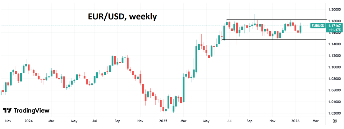 С начала этой недели к среде индекс доллара потерял около 0,9%. Сегодня утром торги DXY идут у отметки 98,5 - это минимальные уровни за последние две недели. На этом фоне пара EUR/USD за последние две сессии подскочила до 1,176. Схожее усиление динамики было и по курсу британского фунта, который укрепился к доллару до 1,345. Курс USD/JPY, где слабые позиции японской иены сочетаются со снижением доллара за последние двое суток особо никуда не двигался, и в среду торги идут возле 158,1. Китайский юань временно прекратил усиление к доллару: торги во вторник и среду USD/CNY идут возле 6,96. Ужесточение риторики Д. Трампа относительно Гренландии в начале этой недели спровоцировали распродажу доллара, казначейских облигаций США и американских акций. Угрозы Трампа вновь повысить пошлины для ряда европейских стран подпитывают опасения по поводу новой торговой войны. Депутаты Европарламента согласились заморозить процесс ратификации соглашения с США по торговле в качестве ответного шага на попытку завладения Гренландией. В текущей ситуации распродажи долларовых активов, евро и швейцарский франк стали главными бенефициарами. Непредсказуемость поведения американского президента во внутренней и внешней политике усиливает тенденцию потери доверия к лидерству США и приводит к дедолларизации и ожиданиям ответных мер со стороны ЕС. Это может усилить процесс избавления инвесторов от американской валюты и активов. Золото, как главный защитный актив, переписало свои исторические максимумы по цене и торгуется возле $4900/унц. Инвесторы также ждут решения Верховного суда США по вопросу о праве американского президента увольнять членов совета управляющих Федеральной Резервной Системы. Это связано с попытками Дональда Трампа уволить Лизу Кук, члена совета управляющих ФРС. На мировом рынке гособлигаций в начале этой недели творится настоящий обвал цен. Все началось с активных продаж японских государственных облигаций. Вместе с этим резко подскочили доходности по US Treasuries. Датский пенсионный фонд AkademikerPension решил продать государственные облигации США до конца января, поскольку есть опасения, что политика Д. Трампа создала слишком большие кредитные риски, чтобы их игнорировать. Стоимость заимствований в Европе тоже выросла, но слабее. Вчера вечером 10-летние USTres можно было купить по 4,3% - максимум с середины августа 2025 г. Аналогичные немецкие Bunds почти не упали в цене и дают сейчас 2,86%. Доходность 10-леток Японии вчера достигла 2,35% - максимум более, чем за 30 лет. Доходность 10-летних государственных облигаций Великобритании выросла до 4,48%. Утром в среду ситуация на рынке бондов слегка корректируется. Доходность 40-летних облигаций Японии выросла до 4%, что стало следствием продажи государственных ценных бумаг перед досрочными выборами. Премьер-министр Японии Санаэ Такаичи объявила о досрочных парламентских выборах, назначенных на 8 февраля, и пообещала временно обнулить налог с продаж на продукты питания в случае победы своей коалиции. Она рассчитывает укрепить хрупкое большинство Либерально-демократической партии, опираясь на высокий личный рейтинг одобрения (67%). Министр финансов Японии Сацуки Катаяма призвала участников рынка "успокоиться" после интенсивных продаж облигаций в последние дни. Не стоит исключать, что на фоне кризиса на долговом рынке, Банку Японии пр