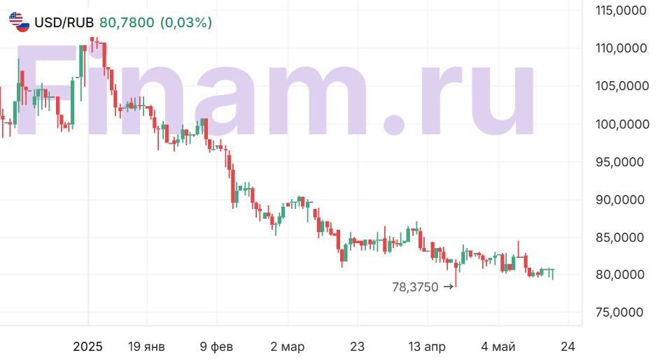 Во вторник 20 мая торги долларом на межбанковском рынке проходят в районе 80,50 руб. – это примерно соответствует тому уровню, который был неделей ранее. Таким образом, в середине мая рубль сохраняет силу, а пара USD/RUB торгуется вблизи своих годовых минимумов.