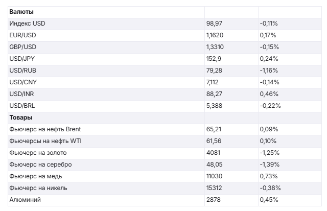 Утром в понедельник индекс доллара продолжает безыдейную консолидацию возле уровней закрытия прошлой недели в районе 98,9. По итогам прошлой недели DXY приподнялся на 0,27% против аналогичного снижения неделей ранее. Этим утром пара EUR/USD торгуется в районе 1,163, что также примерно соответствует закрытию прошлой недели. Скудный поток новостей явно недостаточен, чтобы инвесторы смогли передвинуть курсы ведущих валют на другие уровни. Курс британского фунта стерлингов этим утром находится возле отметки 1,333, прибавляя 0,12%. Курс доллара против иены ожидаемо восстановился до максимумов месяца на 153,2.