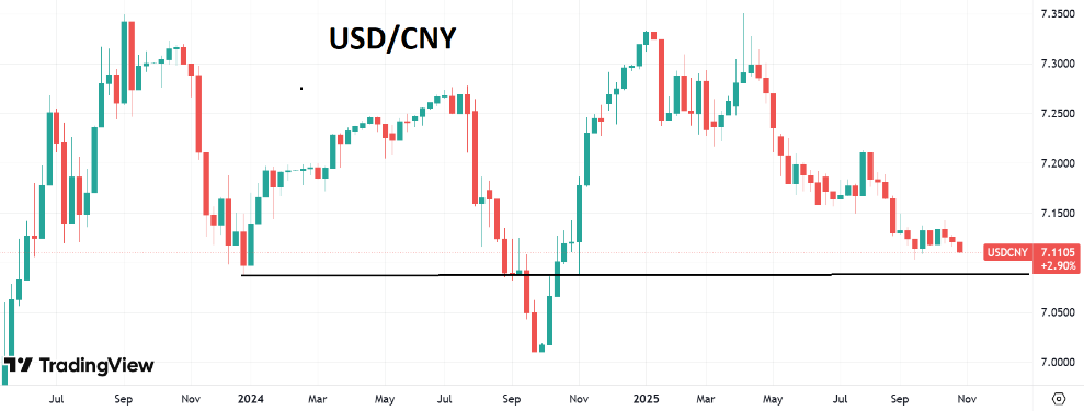 Китайский юань против доллара в начале недели укрепляется на 0,14% до 7,11. При этом цены на золото в понедельник снизилась до $4080/унц. Такая динамика стала возможной благодаря прогрессу в торговых переговорах между США и Китаем. Это снижает спрос на безопасные активы и укрепляет курс китайской валюты. Сообщается, что после обширных переговоров переговорщики США и КНР наконец достигли предварительного соглашения по экспортному контролю, фентанилу, закупкам сельскохозяйственной продукции и транспортным пошлинам. Это создает условия для того, чтобы президент Дональд Трамп и председатель Си Цзиньпин завершили торговую сделку на саммите АТЭС в конце этой недели. Фондовые индексы могут двигаться вверх в ожидании такого сценария. В пятницу индекс доллара завершил сессию практически без изменений. С одной стороны, на доллар оказал негативное влияние пятничный отчёт по инфляции в США, который оказался немного слабее ожиданий. А с другой стороны, курс доллара был поддержан неплохим отчётом по индексам деловой активности в производственном секторе и сфере услуг США от S&P за октябрь. Пятничные данные показали менее существенный, чем ожидалось, рост инфляции в США в сентябре. Темпы роста потребительских цен (CPI) в стране в прошлом месяце повысились до 3% в годовом выражении с 2,9% в августе. Это ниже, чем ожидалось (3,1%). По сравнению с предыдущим месяцем индекс потребительских цен вырос на 0,3%, что ниже 0,4% в августе при прогнозе 0,4%. Индекс цен на бензин вырос на 4,1% и стал основным фактором общего роста цен. Базовый индекс (CPI Core) вырос на 0,2%, что ниже 0,3% в августе при прогнозе 0,3%. Доходность 10-летних казначейских облигаций США упала ниже 4% в пятницу после выхода более низких цифр по инфляции в США, поскольку это означает, что ФРС продолжит смягчать ДКП в этом году. Снижение ставки на 25 б.п. на заседании на следующей неделе – дело уже почти решенное. Свежий отчёт по индексу деловой активности в производственном секторе США от S&P за октябрь, зафиксировал рост до 52,2 п., что выше ожиданий неизменного значения на уровне 52,0 п. Кроме того, октябрьский индекс деловой активности в сфере услуг США от S&P также вырос до 55,2 п., превысив прогнозное снижение до 53,5 п. Сводный индекс S&P Global US Composite PMI вырос в октябре до 54,8 п. с 53,9 п. в сентябре, что стало самым высоким значением с июля и сигнализирует о росте, немного превышающем средний показатель за 3-й квартал. Тем не менее, на доллар продолжает давить тема не работающего правительства США. Чем дольше будет продолжаться этот период, тем выше риски негативного влияния на всю экономику США, а значит тем выше вероятность того, что ФРС будет вынуждена снизить процентные ставки. Более низкие, чем ожидалось, показатели инфляции в США укрепляют мнение инвесторов о том, что инфляционное давление, связанное с повышением торговых тарифов, остается сдержанным. Индекс потребительских настроений Мичиганского университета в США в октябре был пересмотрен в сторону понижения до 53,6 п. с предварительных 55,0 п. и 55,1 п. в сентябре. Это самый низкий показатель за пять месяцев, при этом как текущая ситуация (58,6 против 61), так и индекс ожиданий (50,3 против 51,2) были пересмотрены в сторону понижения. На этой неделе пройдут важные заседания по денежно-кредитной политике. FOMC Федеральной резервной системы проведёт заседание без обычных статданных из-за