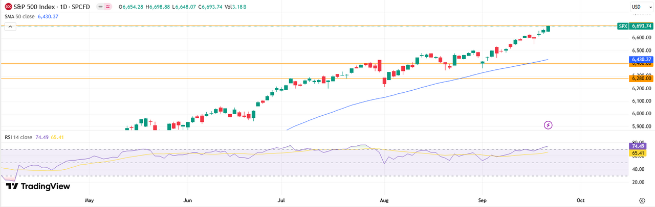 На дневном графике, индекс МосБиржи нашел поддержку в районе 2700 пунктов и пытается сформировать коррекционный отскок в направлении уровня 2850 пунктов, в районе которого также проходит 50-дневная скользящая средняя. S&P 500 Индекс S&P 500 обновил исторические максимумы, закрепившись на уровне 6 694. RSI (74,5) сигнализирует о сильной перекупленности и рисках коррекции. При фиксации прибыли и снижении индекса активизация покупателей вероятна в районе 6400–6500. Если же давление продавцов окажется недостаточным, наиболее вероятен сценарий консолидации вблизи 6 700 пунктов.