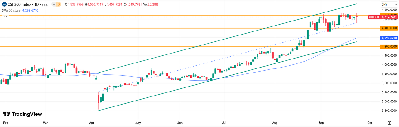 CSI 300 Индекс CSI 300 закрылся в небольшой минус на уровне 4519, после очередного тестирования сопротивления на отметке 4 540 пунктов. В случае более сильной коррекции ждем активизацию покупателей на уровне 4 400 пунктов.