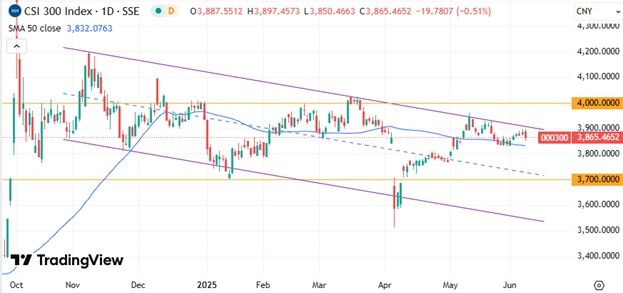 CSI 300 На дневном графике CSI 300 продолжает консолидироваться между верхней границей среднесрочного нисходящего канала и 50-дневной скользящей средней. Если индексу удастся выйти из фигуры наверх, первой целью дальнейшего повышения станет уровень 4000 пунктов.