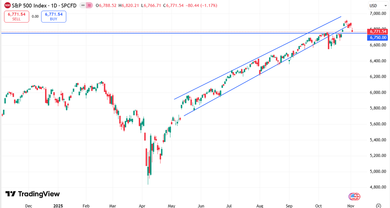 S&P 500 Индекс S&P 500 торгуется на уровне 6 771,5 пунктов, индекс на протяжении последних месяцев двигался в рамках восходящего канала. Однако на текущем этапе наблюдается пробой нижней границы канала, что указывает на ослабление восходящего импульса и повышает вероятность формирования коррекционной фазы. В случае оказания давления, индекс может снизиться к уровню поддержки 6 750 пунктов.
