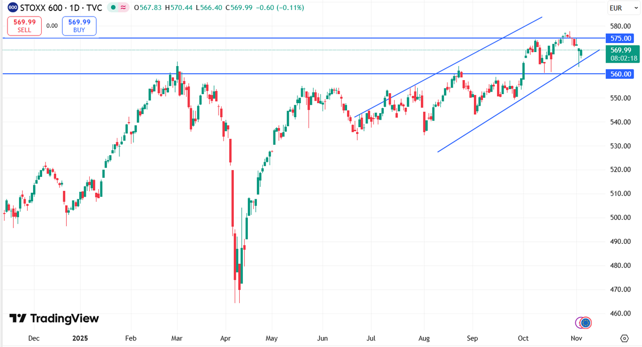 Euro STOXX 600 Индекс STOXX 600 торгуется на уровне 569,9 пункта. Несмотря на сохранение движения в рамках восходящего канала, в настоящее время наблюдается коррекционная фаза. При сохранении давления на рынок существует риск пробоя уровня поддержки в районе 560 пунктов.
