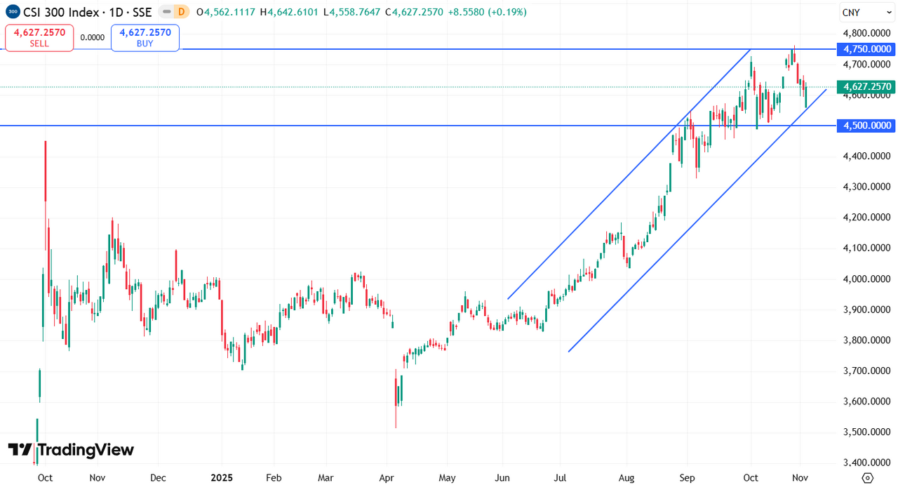 CSI 300 Индекс CSI 300 находится на уровне 4 627,3 пункта. Индекс достиг зоны сопротивления в районе 4 750 пунктов. В последние дни наблюдается коррекция, индекс перешёл к боковому движению в диапазоне 4 500-4 700 пунктов.