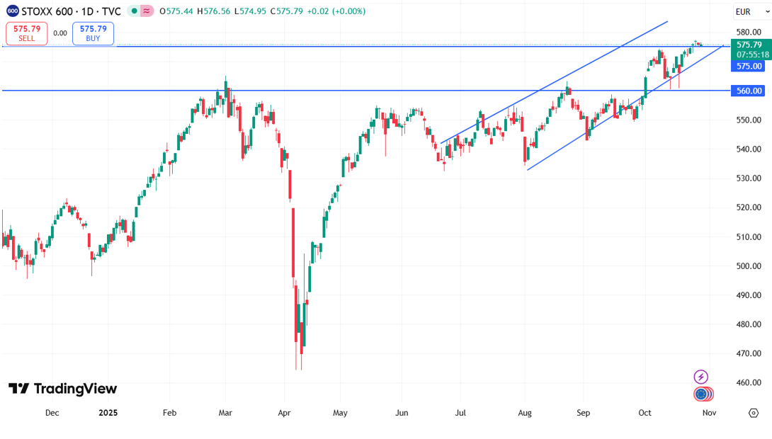Euro STOXX 600 Индекс STOXX 600 торгуется на уровне 575,9 пункта. Индекс остаётся в границах восходящего канала на историческом максимуме.