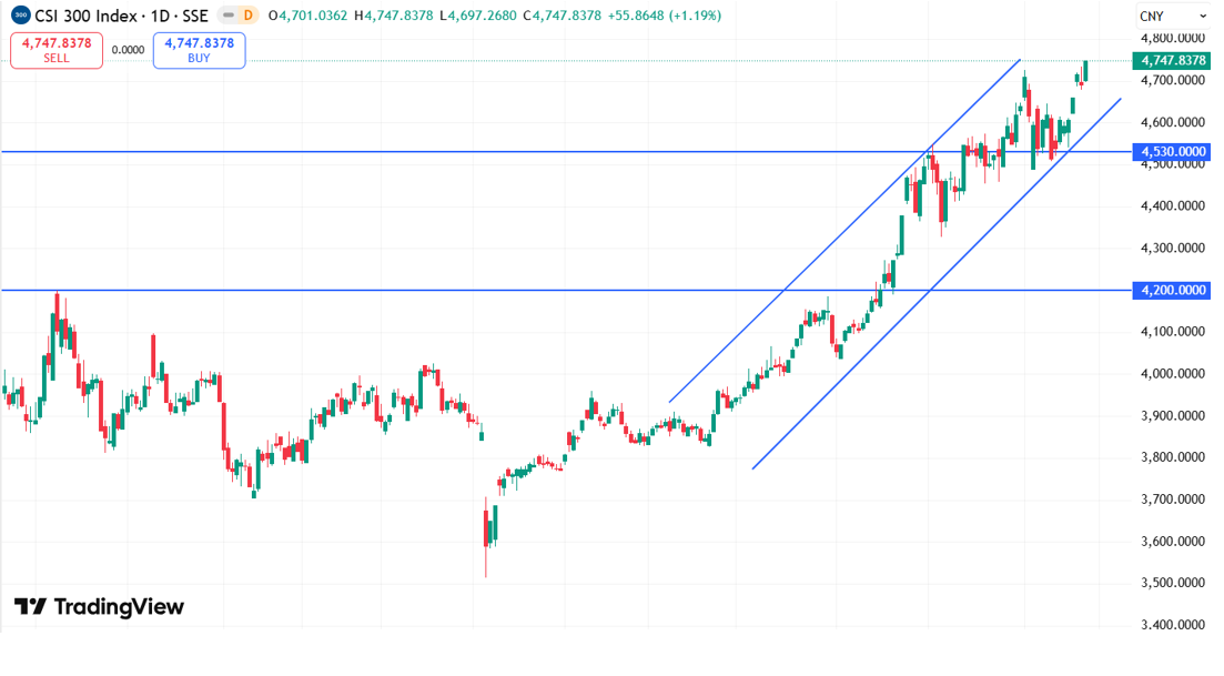 CSI 300 Индекс CSI 300 поднялся до уровня 4 747,8 пункта, преодолев все предыдущие исторические максимумы. Движение сохраняется в рамках устойчивого восходящего тренда. При сохранении положительных настроений на рынке индекс может достичь отметки 4 800 пунктов в краткосрочной перспективе.