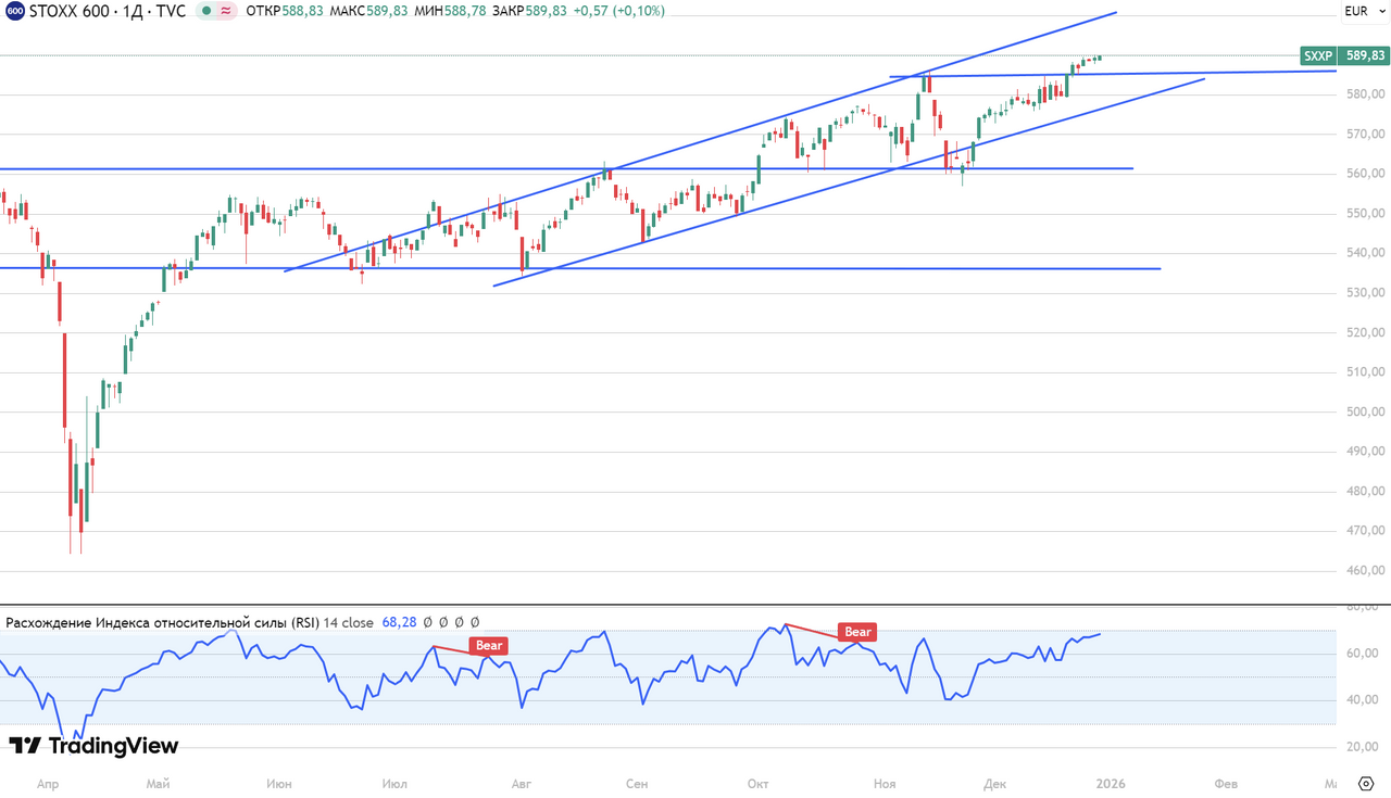 Euro STOXX 600 Европейский индекс STOXX600 продолжает находится в многомесячном восходящем тренде. Рынок ежедневно переписывает свои исторические максимумы, но темп уже уменьшается. Поскольку рынок сильно перекуплен (RSI=68п), возможна краткосрочная коррекция до уровня поддержи 585 пунктов, после чего рост продолжится в рамках тренда.