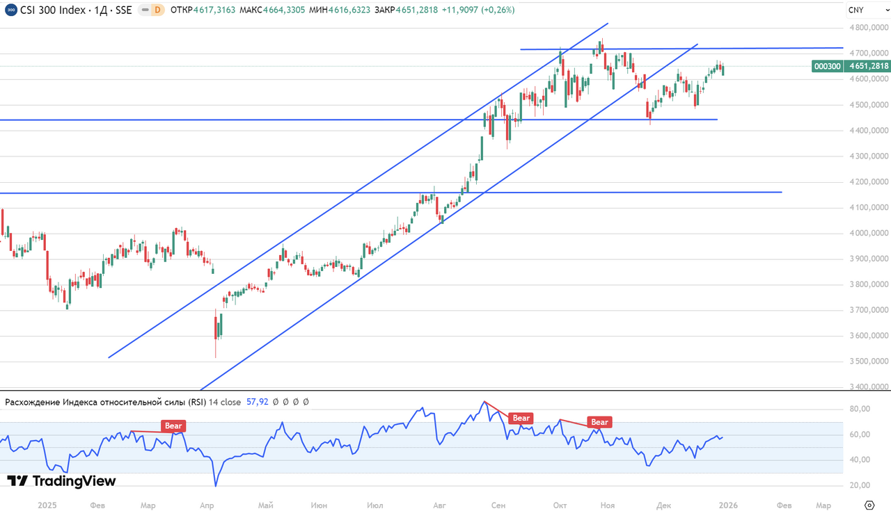 Американские индексы в понедельник закрылись снижением, страх в технологическом секторе оказался сильнее новогоднего ралли. По итогам торговой сессии в понедельник: S&P 500 снизился на 0,35% до 6905 пунктов, Dow Jones ― на 0,51% до 48 461, Nasdaq Composite ― на 0,50% до 23 474. Во вторник фьючерс на S&P 500 снижается на 0,17%, инвесторы ждут основной сессии в США. Европейские индексы сегодня торгуются разнонаправленно ― в целом, около нулевой отметки на фоне скудной ликвидности конца года и осторожного поведения участников рынка. Инвесторы ждут публикации протокола декабрьского заседания ФРС и оценивают последние геополитические риски, что сдерживает более уверенный рост. Текущие значения основных индексов: FTSE 100 — 9874,83 (+0,08%), CAC 40 — 8103,91 (-0,10%), DAX — 24 369,73 (+0,02%), Euro Stoxx 50 — 5750,46 (-0,02%) Давление на отдельные бумаги формируют как корпоративные факторы, так и общее снижение рынка. Сильнее рынка снижаются акции Flutter Entertainment (-0,68%), Bayer (-0,60%), BMW (-0,56%), а также бумаги люксового сегмента — Louis Vuitton (-0,41%) и L’Oreal (-0,33%). Азиатские фондовые площадки в основном снижаются в ходе сегодняшних торгов, повторяя негатив по итогам сессии Уолл-стрит накануне и действуя в условиях низкой ликвидности конца года. Инвесторы при этом ждут публикации протокола декабрьского заседания ФРС во вторник — участники рынка рассчитывают получить подсказки о том, насколько разнятся мнения внутри комитета по траектории ставок в 2026 году. Дополнительное давление на региональные площадки оказывают военные учения Китая вблизи Тайваня, усиливающие геополитическую неопределенность и риск-аппетит инвесторов. На китайском рынке наблюдается смешанная картина: индекс Shanghai–Shenzhen (CSI 300) показывает умеренный рост на 0,26% до 4651 пунктов в течение дня, движение носит взвешенный характер и отражает баланс между осторожным спросом со стороны инвесторов и сохраняющимися структурными рисками в экономике. Поддержку рынку оказывает сохраняющаяся мягкая монетарная позиция Народного банка Китая и ожидания дополнительных мер по стимулированию экономики и технологического сектора, в то же время сектор недвижимости остается источником давления из-за проблем застройщиков и высокой долговой нагрузки. Hang Seng растет на +0,76% до 25 830,50 пункта — рынок выглядит чуть сильнее ожиданий. Технологические и отдельные ресурсо-энергетические компании выглядят сильнее рынка, в то время как часть потребительских и развлекательных компаний остается под давлением. В числе лидеров роста выступают бумаги Baidu (+8%), CNOOC (+4,9%), SMIC (+3,7%), PetroChina (+3,3%), Geely (+2,9%). Снижаются бумаги Pop Mart (-5,8%), Innovent Biologics (-2,3%), Sands China / Budweiser APAC (-1,7%), Xinyi Solar (-1,6%). Японский Nikkei 225 составляет 50 343,50 пункта и снижается на 0,36%. Движение сдерживается укреплением иены и спекуляциями вокруг возможных валютных интервенций, что давит на экспортоориентированные бумаги. В лидерах снижения — Sumitomo Metal Mining (-4,1%), Japan Steel Works (-2,8%), Rakuten (-2,6%), Shiseido (-1,9%), Resonac (-1,8%). Лучше рынка торгуются Fujitsu (+2,9%), Ibiden (+2,4%), Nissan Motor (+1,7%), Murata (+1,6%), Tokyo Electric Power (+1,4%). KOSPI находится на уровне 4214,17 пункта и теряет 0,15%. Рынок отыгрывает смешанные макроданные: промпроизводство в ноябре выросло на 0,6% (м/м), но розничные продажи снизились на 3,3% (м/м), что формирует осторожный настрой инвесторов. В структуре рынка под давлением оказываются Posco (-2,4%), Korean Air (-1,1%), тогда как Hyundai Motor (+0,8%) и Samsung Electronics (+0,8%) демонстрируют умеренный рост со стороны инвесторов. Р