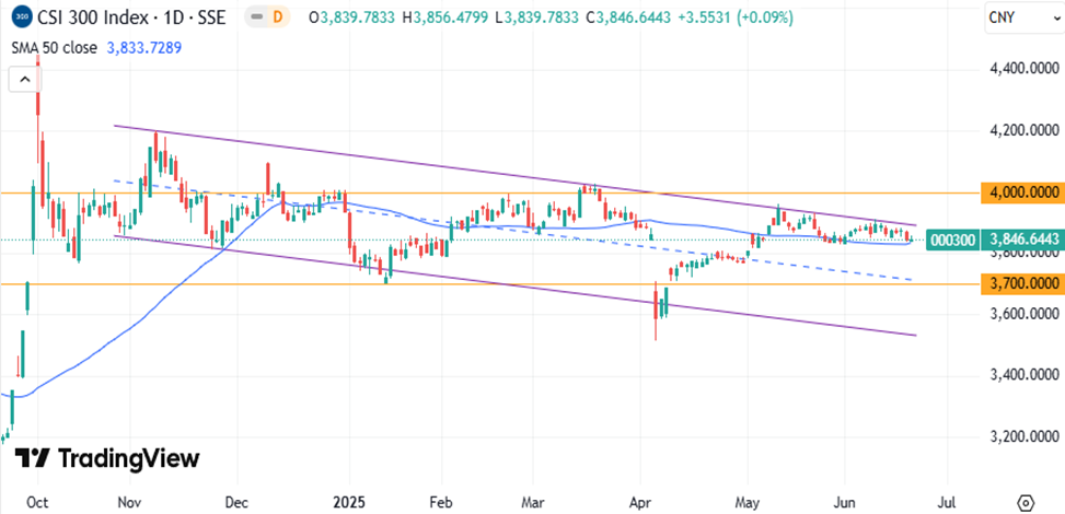 CSI 300 На дневном графике CSI 300 оттолкнулся от верхней границы среднесрочного нисходящего канала и опустился к 50-дневной скользящей средней, которую может протестировать на предмет пробития в ближайшие дни. В случае закрепления ниже данной линии первой целью дальнейшего снижения станет поддержка 3700 пунктов.