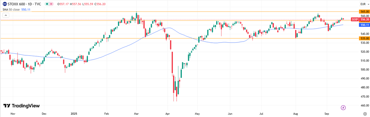 Euro STOXX 600 Индекс Stoxx 600 находится на уровне 556 и предпринимает очередную попытку закрепиться выше бокового диапазона 535-555. Ожидаем консолидацию индекса вблизи уровня 555.