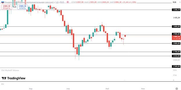 - Индекс национальной активности ФРБ Чикаго за апрель (22 мая); На корпоративном фронте инвесторы будут следить за отчётностями таких крупных компаний как Lowe’s, Target, Best Buy, Autodesk, Intuit, Dollar Tree и многих других. По состоянию на 12:00 МСК европейский STOXX 600 снижается на 0,67%, а фьючерс на S&P 500 на 1,29%. Доходность 10-летних казначейских облигаций США растёт на 10 б.п. и составляет 4,539%. Китайский CSI 300 снизился на 0,37%, а гонконгский HangSeng на 0,05%. Фьючерсы на нефть Brentопускаются на 0,56%. Индексы Мосбиржи и долларовый РТС растут на 1,40%. Акции Charter Communications прибавили 1,83% в начале сессии после объявления о слиянии с частной телеком-компанией Cox Communications, стоимость которой оценивается в $34,5 млрд, включая $12,6 млрд долгов. Cox получит $4 млрд наличными и около $18 млрд в виде конвертируемых бумаг. Бумаги Nvidia также выросли на 0,42% — фонд Soros Fund Management, основанный инвестором Джорджем Соросом, впервые приобрел акции компании в первом квартале. Капитализация Microsoft, чьи акции входят в состав стратегии «US. Сбалансированная», приподнялись на 0,25% после того, как компания предложила европейским пользователям купить пакет Office без Teams по сниженной цене, стремясь устранить антимонопольные претензии со стороны Еврокомиссии. В апреле 2024 года промышленное производство в Китае выросло на 6,1% по сравнению с аналогичным периодом прошлого года, свидетельствуют данные Государственного статистического управления КНР. При этом темпы роста замедлились по сравнению с мартом, когда показатель составлял 7,7%. Согласно прогнозам аналитиков, опрошенных порталом Trading Economics, ожидалось еще более сдержанное увеличение — в среднем на 5,5%. Фактический результат оказался лучше этих ожиданий. Розничные продажи в Китае в апреле также показали рост — на 5,1% год к году против мартовских 5,9%. Этот показатель оказался ниже консенсус-прогноза, который предполагал рост на 5,5%. Что касается инвестиций в основные фонды, за первые четыре месяца года они увеличились на 4%. Это незначительно ниже ожиданий экспертов, которые прогнозировали рост на уровне 4,2%. Наиболее существенное снижение котировок на Гонконгской фондовой бирже показали акции чипмейкера Sunny Optical Technology Group - на 3,27%, ритейлера Alibaba - на 3,40%, автопроизводителя Li Auto - на 3,18%. Российский рынок традиционно находится под влиянием геополитических новостей. Инвесторы ожидают звонка Владимира Путина и Дональда Трампа, который может состояться в 17:00 мск. Это будет третий звонок двух президентов с начала года. Главные вопросы, которые планируется обсудить во время переговоров, будут касаться Украины и торговли между двумя странами. Рынок может позитивно воспринять ожидание звонка, но мы не ждём каких-либо позитивных новостей по факту переговоров. Поэтому вероятно снижение по окончании разговора. Среди лидеров роста: Абрау Дюрсо (+2,08%), ОВК (+1,22%), НоваБев (+0,83%). В лидерах снижения сегодня только: Ростелеком (-2,07%), МТС (-1,98%), Мосэнерго (-1,85%). Техническая картина Индекс Мосбиржи Индекс вновь ниже уровня 2900 пунктов. Вероятно снижение до 2850 для закрытия гэпа от предыдущей свечи.