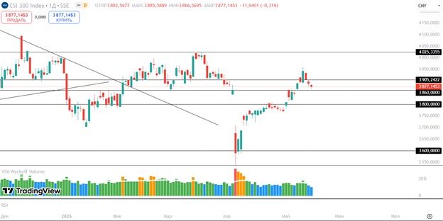 CSI 300 Индекс тестирует 3860 пунктов. При удержании уровня возможен рост до 4025 пунктов.
