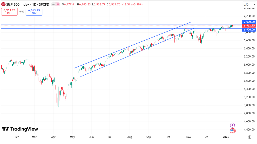 S&P 500 Индекс S&P 500 торгуется на уровне 6 963,8 пункта. В случае поступления позитивных факторов рынок может получить импульс для обновления исторического максимума и вырасти выше отметки 7 000 пунктов. В то же время сохраняется вероятность коррекционного движения и возврата индекса в диапазон 6 700-6 900 пунктов.