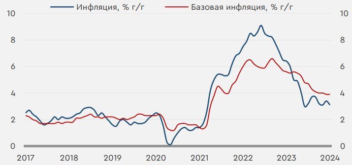 На мировом рынке во вторник резко усилились risk-off настроения. Вчерашняя статистика из США указала на заметное более высокие, чем ожидалось, темпы роста цен в январе, что уменьшило вероятность скорого снижения ставки ФРС. В России вчерашний день отметился лишь публикацией январских данных по внешней торговле. Экспорт товаров и услуг в месячном выражении снизился на $10,2 млрд до $32,6 млрд, но импорт сократился сильнее - на $12,3 млрд до $24,5 млрд. Счет текущих операций в январе составил $6,4 млрд против $0,7 млрд в декабре, но в целом риски сокращения экспорта из-за санкций сохраняются. Сегодня инвесторы в мире обратят внимание на декабрьские данные по промышленному производству в еврозоне, дальнейшие события сезона отчетностей, а также на заявления представителей регуляторов. На российском рынке в среду выйдет целый ряд экономической статистики. Во-первых, Росстат, помимо традиционных недельных данных по инфляции, опубликует полную ценовую статистику за январь. Во-вторых, Банк России сегодня в кратком формате выпустит февральские оценки инфляционных ожиданий населения и бизнеса, важные в преддверии заседания регулятора в пятницу. Нефть и рубль Вчера нефтяные цены смогли вырасти даже на фоне укрепившегося после выхода ценовой статистики в США доллара. Геополитические новости продолжают оказывать поддержку котировкам, а ОПЕК вчера в своем месячном отчете оставила без изменений свои прошлые прогнозы о значимом росте спроса на нефть. Сегодня фьючерсы Brent торгуются у $82,8/барр. На динамику котировок сегодня повлияют недельные данные по запасам от Минэнерго США. Если они, как и ночные оценки от API, укажут на неожиданно сильный рост запасов, цены на нефть могут снижаться в сторону $81/барр. Рубль во вторник вновь не показал ярко выраженную динамику. Активность на рынке остается низкой как в связи с праздниками в Китае, так и в преддверии заседания ЦБ РФ. Сегодня курс USDRUB находится у 91,3 руб./$. Другие курсы валют EM с утра двигаются разнонаправленно. В целом на фоне глобального укрепления доллара курс USDRUB может на время уйти в сторону 92 руб./$. Ценовая статистика в США Вчерашние данные из США указали на замедление инфляции в январе с 3,4% г/г лишь до 3,1% г/г (прогноз 2,9% г/г). В месячном выражении темпы роста цен увеличились на 0,1 п.п. до 0,3% м/м (прогноз 0,2% м/м), до максимальных с сентября уровней. Такой динамике способствовало ускорившееся с 0,2% м/м до 0,4% м/м удорожание продовольствия. При этом темпы роста цен на проживание увеличились за месяц на 0,2 п.п до 0,6% м/м, а на транспортные услуги – на 0,9 п.п. до 1% м/м. На этом фоне базовый показатель инфляции (за исключением цен на продовольствие, энергию и пр. волатильных компонент) в январе продолжил расти темпами в 3,9% г/г (прогноз 3,7% г/г). Такая статистика сдвинула рыночные ожидания начала снижения ставки ФРС с мая на июнь, что оказало заметное давление на рисковые активы. Инфляция и базовая инфляция в США
