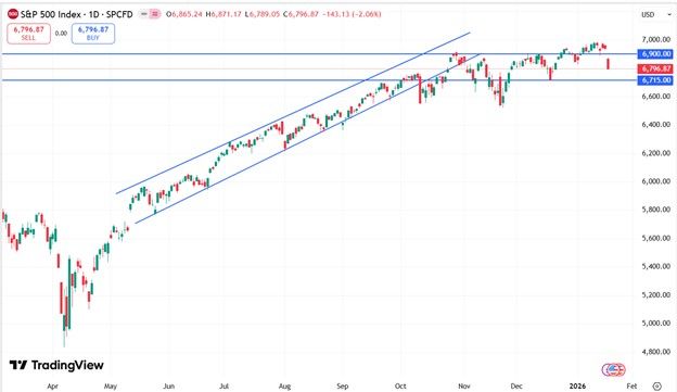 S&P 500 Индекс S&P 500 торгуется на уровне 6796,8 пункта, опустившись ниже уровня сопротивления 6900 пунктов, который ранее выступал в качестве уровня поддержки. В случае сохранения негативного рыночного фона индекс может продолжить снижение в направлении уровня поддержки 6715 пунктов.