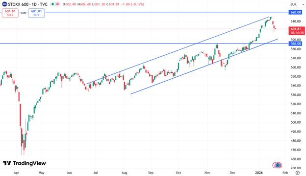 Euro STOXX 600 Индекс STOXX 600 торгуется на уровне 601,8 пункта, демонстрируя снижение на фоне заявлений о возможном приобретении США Гренландии. При сохранении негативного новостного фона индекс может продолжить коррекцию и опуститься к уровню поддержки в районе 586 пунктов.
