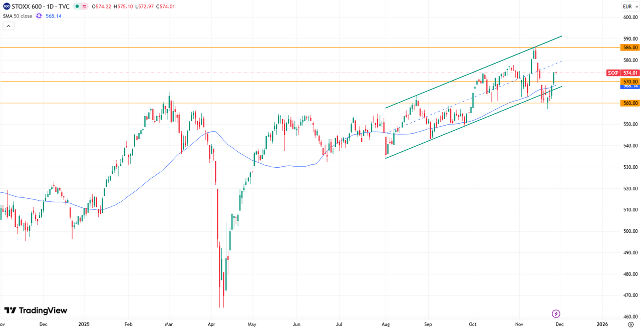 Euro STOXX 600 Индекс Stoxx 600 на дневном графике слегка корректируется до 574,1 пункта. В случае развития коррекционного движения поддержкой выступит линия 50-дневной SMA (568,1), которая проходит вблизи нижней границы серднесрочного восходящего канала.