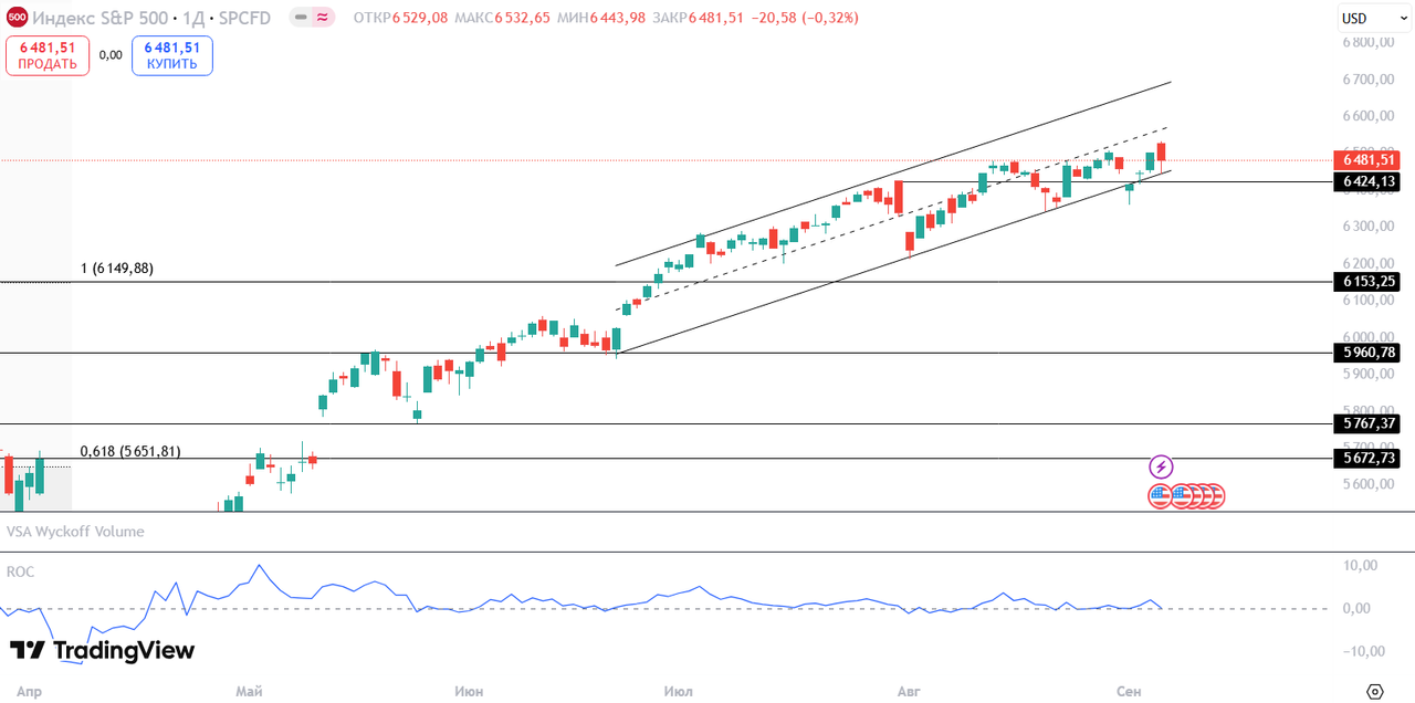 S&P 500 Индекс снижается после обновления исторического максимума, который совпадает с нижней границей восходящего канала. При пробитии уровня 6424 пункта возможно дальнейшее снижение в район 6153 пункта. При удержании уровня возможен рост до верхней границы канала.