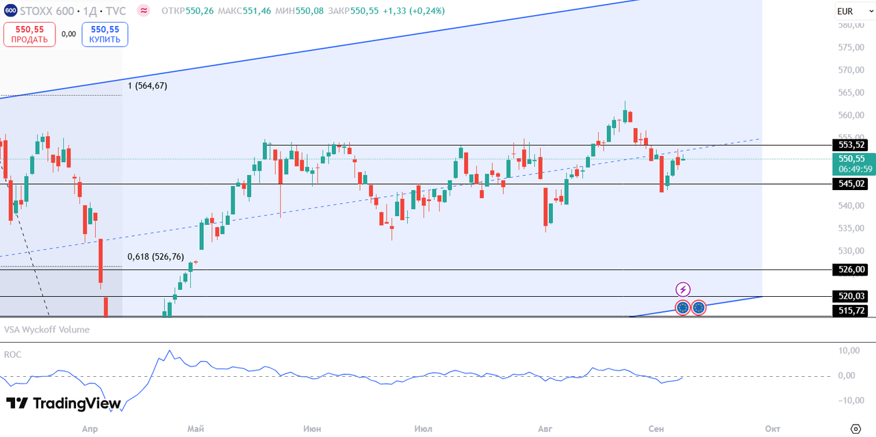 Euro STOXX 600 STOXX 600 Не удержал средний уровень глобального восходящего канала. Возможно снижение до уровня поддержки 545 пунктов.